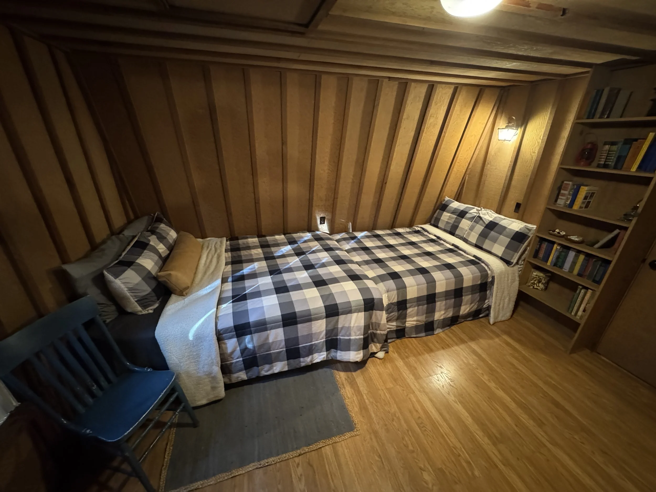Upstairs Left: We have 1 bedroom (1 queen bed, 1 double bed, and one full closet for your use), and 1 private bathroom (sink, toilet, and shower).